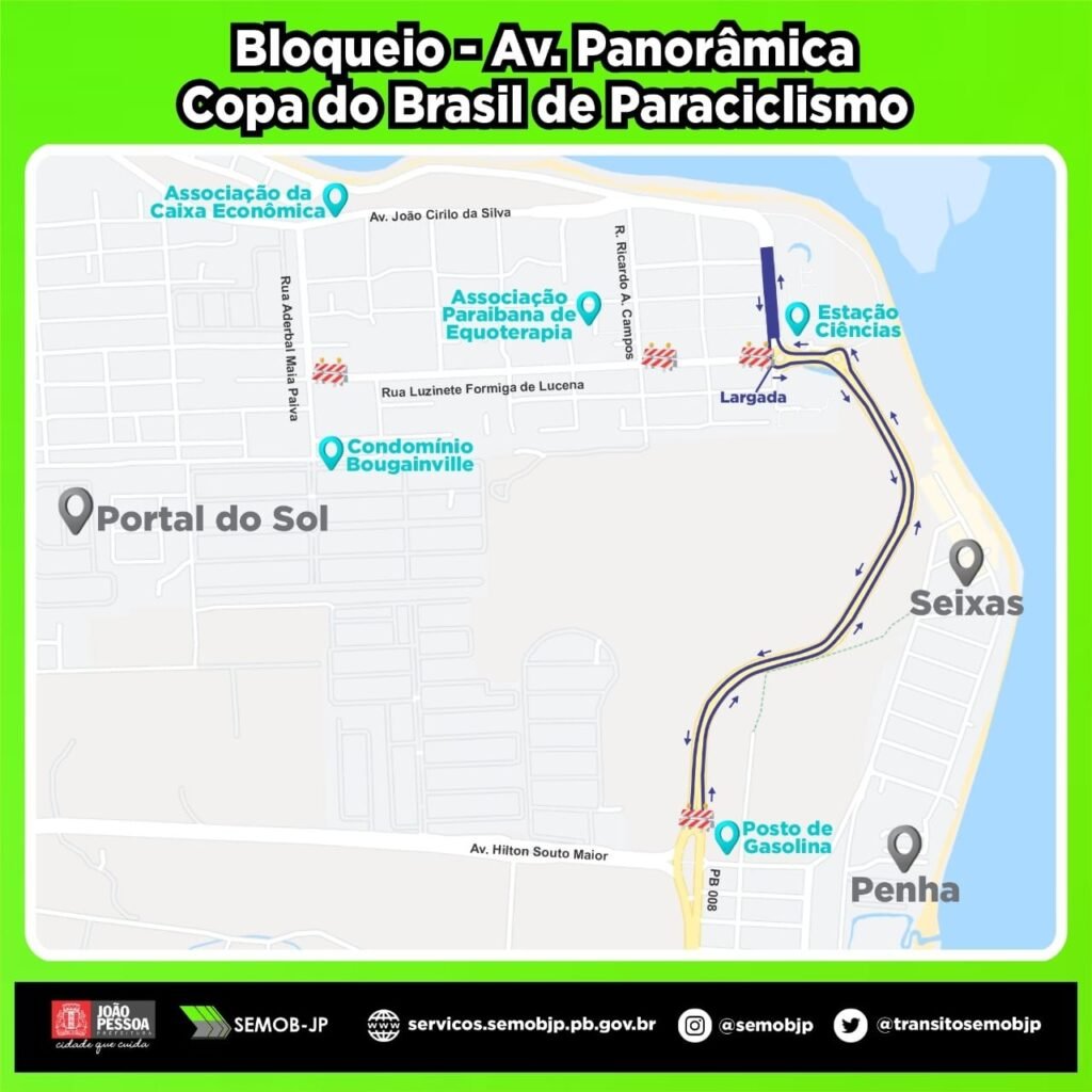 Para garantir a segurança viária dos participantes da 1ª etapa da Copa Brasil de Paraciclismo, que será realizada neste fim de semana em João Pessoa, a Superintendência Executiva de Mobilidade Urbana (Semob-JP) informa, que o trecho da Avenida Panorâmica, entre a Estação Cabo Branco – Ciência, Cultura e Arte e a entrada do bairro da Penha, estará sendo isolado para uso apenas dos participantes do evento.